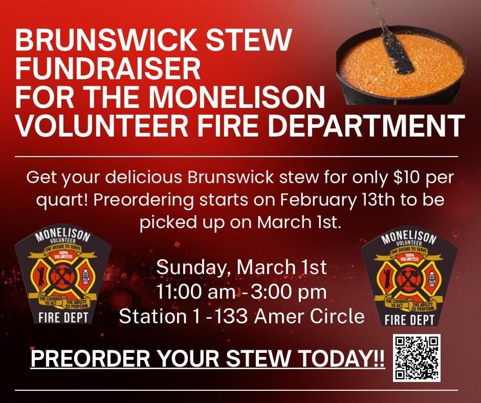 Quarts of Brunswick stew will be available for sale tomorrow between 11:00 a.m. and 3:00 p.m. The price is $10.00 per quart for carry-out only. Lemonade will also be available. Credit cards and cash will be accepted.